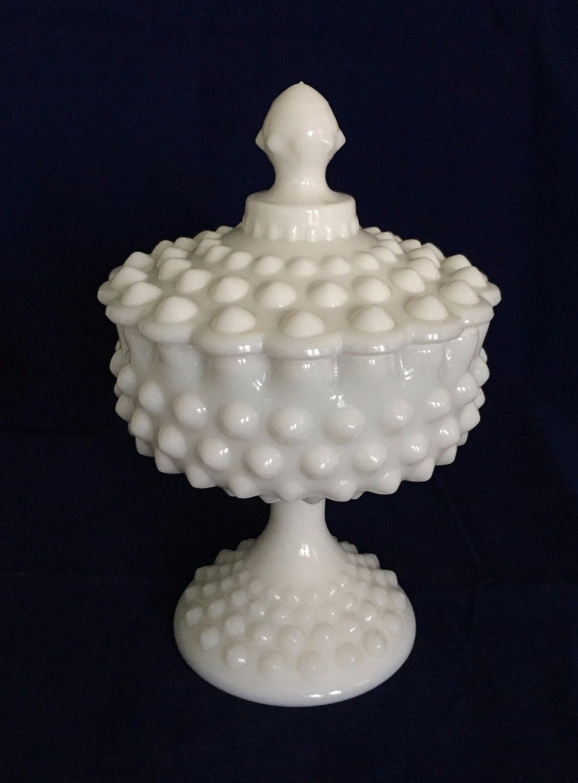 Title (ebay affiliate link): Beautiful Vintage Fenton Hobnail Milk Glass Pedestal Covered Compote ~ 8 1/2"