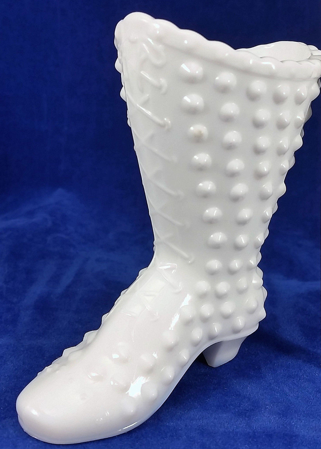 VINTAGE FENTON WHITE MILK GLASS HOBNAIL LADIES LACE UP HIGH TOP BOOT