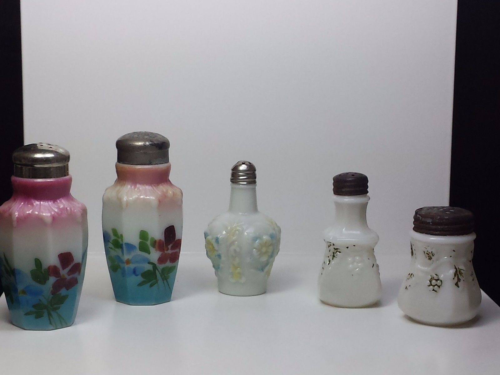 Title (ebay affiliate link): Lot 5 Antique Hand Painted Raised Sroll Pattern Milk Glass Salt & Pepper Shakers