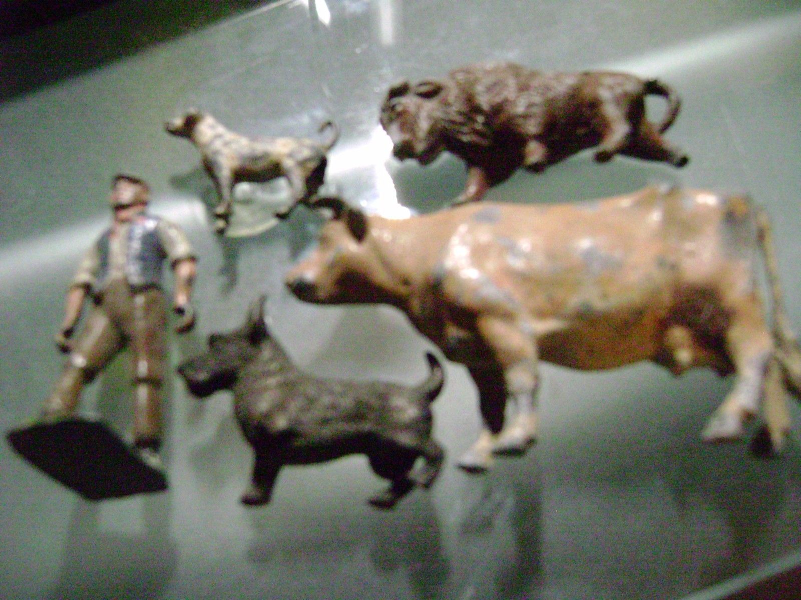 LEAD FIGURINES - MAN, DOGS, BUFFALO, AND COW
