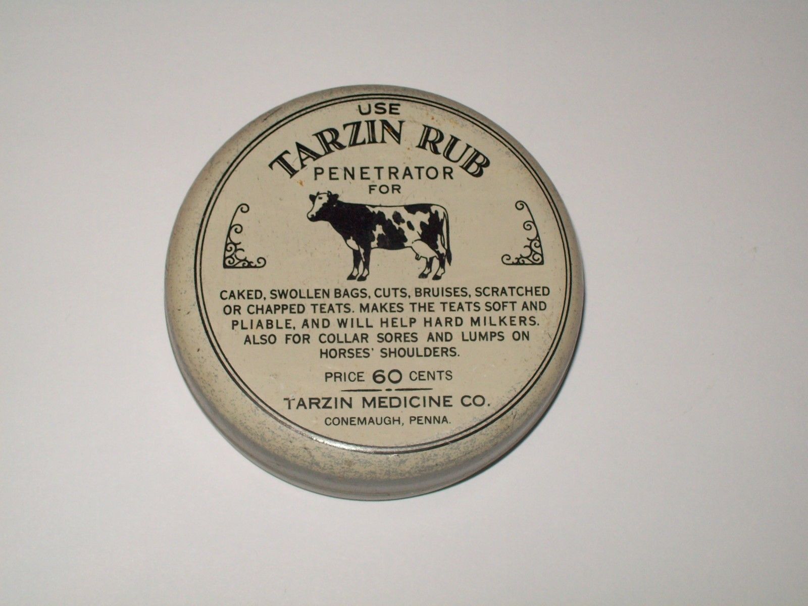Title (ebay affiliate link): Vintage-Round-Advertising-Tin-TARZIN RUB-Penetrator-Cow-Salve-60 cents-Empty