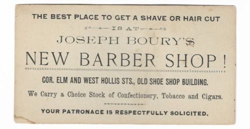 Title (ebay affiliate link): 1880s Joseph Boury Barbershop Nashua NH Barber Trade Card Advertising Cigars