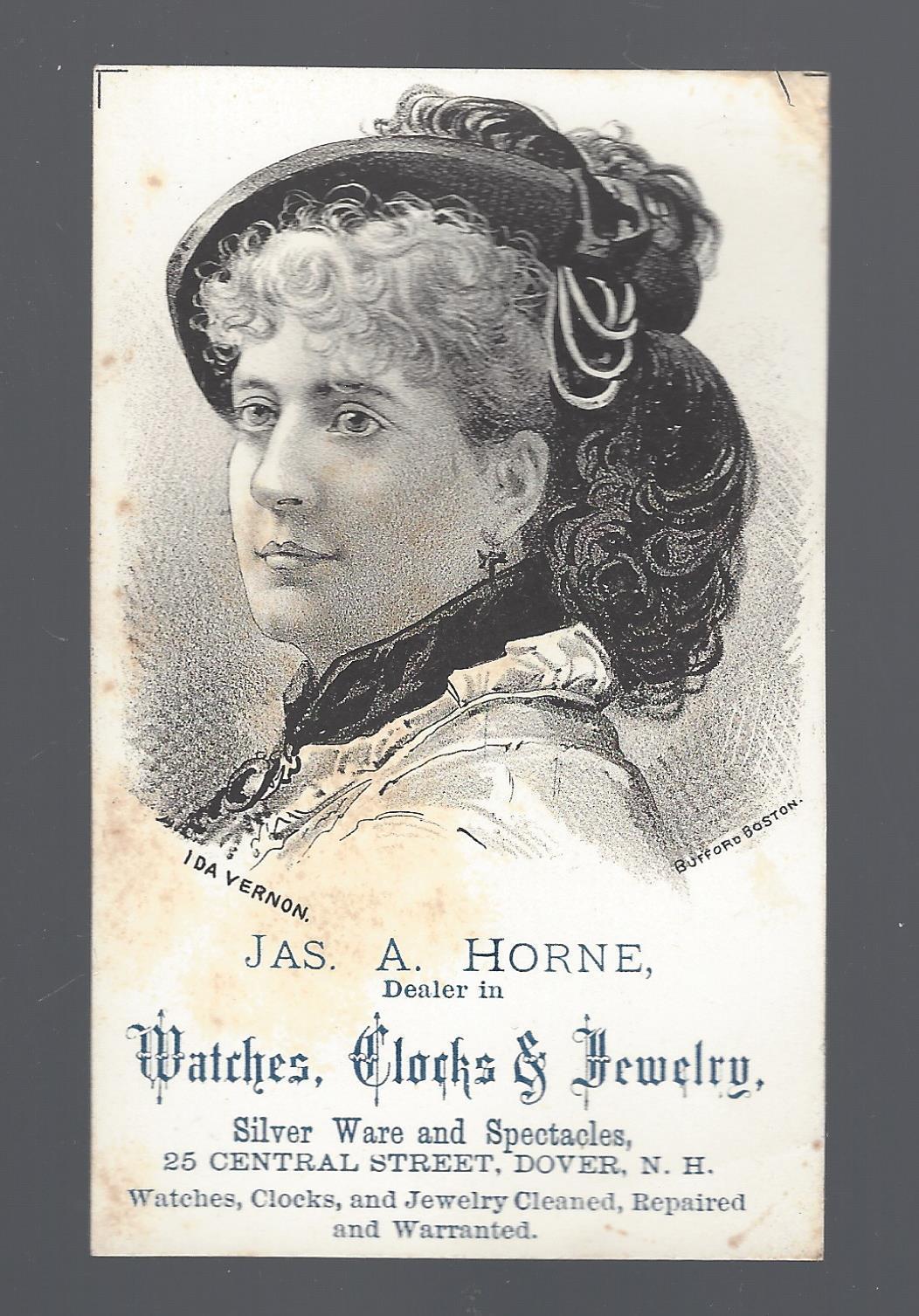 JAMES HORNE,NEW HAMPSHIRE JEWELER TRADE CARD,IDA VERNON IMAGE,GOOD CONDITION