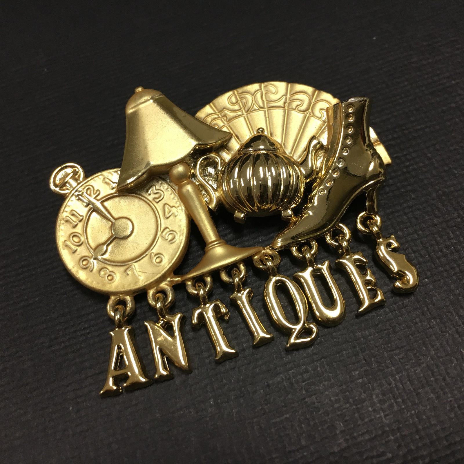 Vintage Estate AJC "Antiques" Lamp Fan Clock Charm Brooch Pin Gold Tone E179e