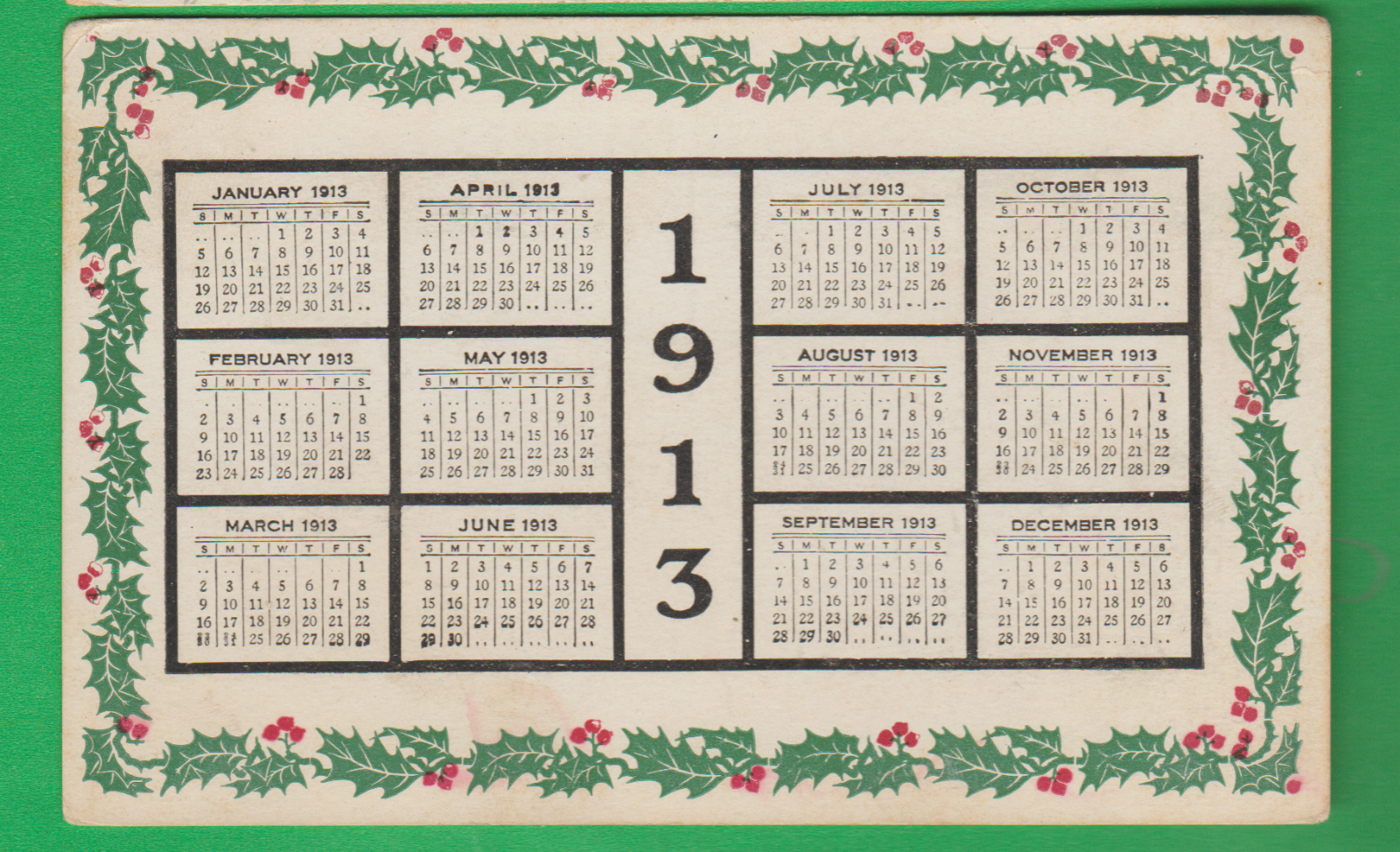 1913 calendar postcard/ holly & berries going around the border/ non-linen pc