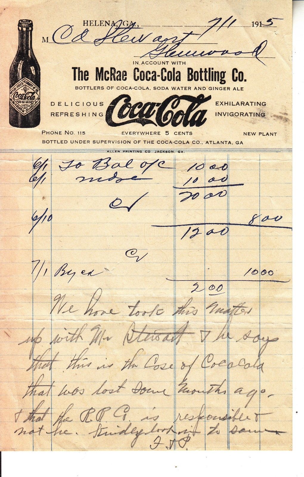 Title (ebay affiliate link): THE McRAE COCA-COLA BOTTLING CO. INVOICE . DATED 7/1 1915