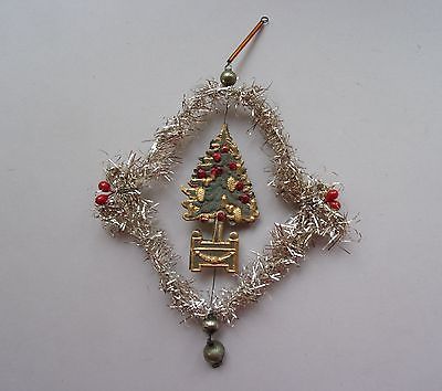 Title (ebay affiliate link): ANTIQUE PAPER CHRISTMAS TREE IN TINSEL FRAME CHRISTMAS ORNAMENT