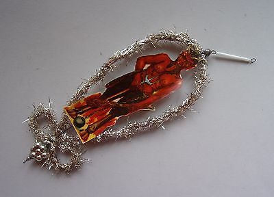 ANTIQUE PAPER KRAMPUS THE DEVIL IN TINSEL FRAME CHRISTMAS ORNAMENT