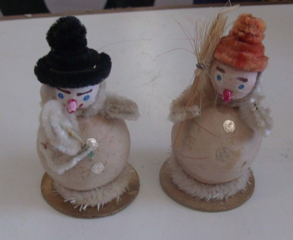 2 Vintage Spun Cotton Christmas Snowman Figures