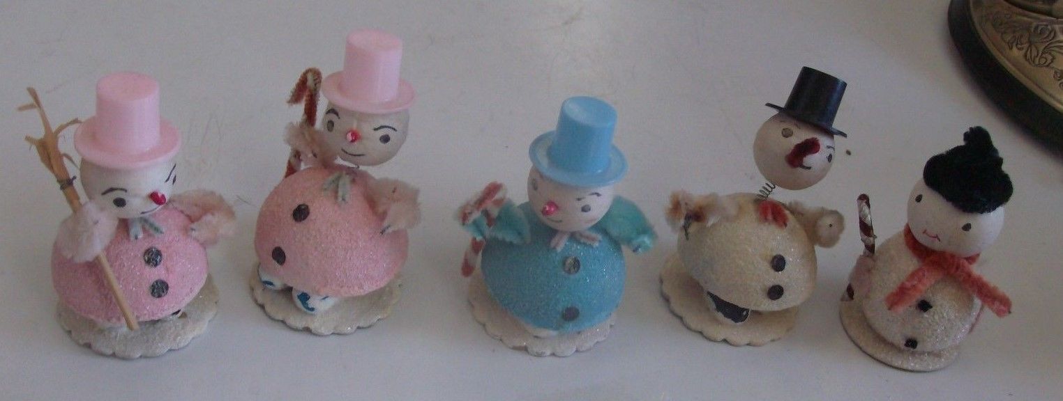 Title (ebay affiliate link): 5 Vintage Mica Putz Cardboard Christmas Snowman Figures - Japan