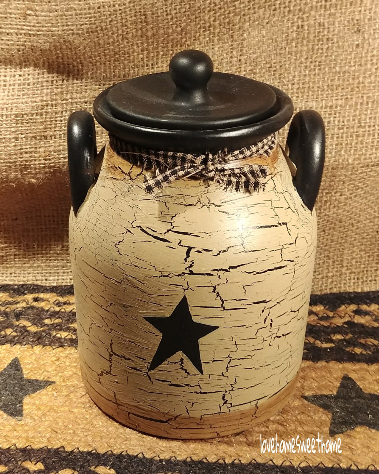 Title (ebay affiliate link): Primitive Crackle Tan & Black Stars Ceramic Canister with Handles Country Decor