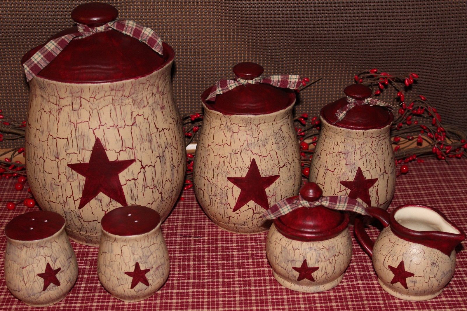 Title (ebay affiliate link): 7 PC Primitive Crackled Canister Set, Lidded Sugar, Creamer, Salt & Pepper, Star