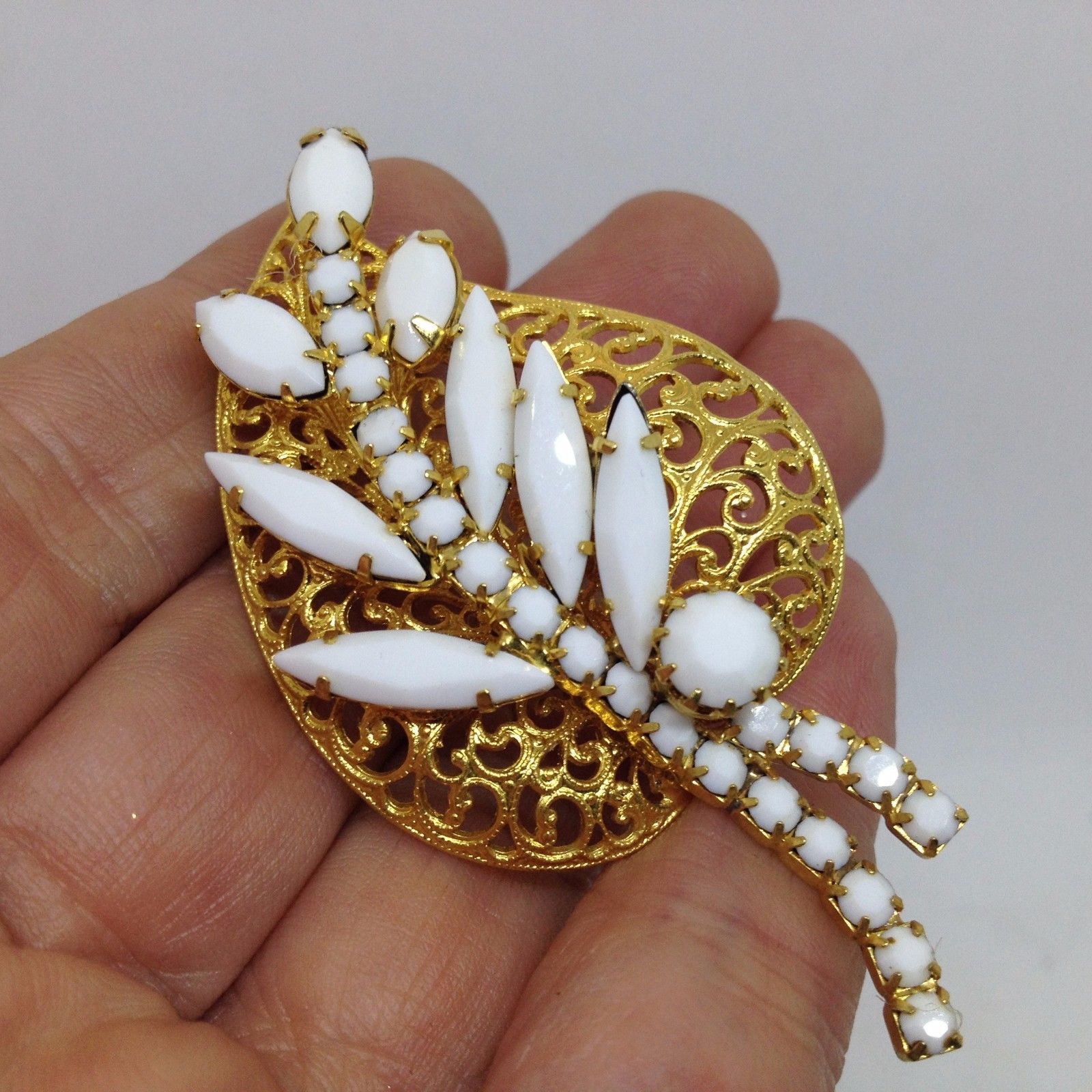 Title (ebay affiliate link): Vintage FILIGREE LEAF BROOCH PIN White Milk Glass Gold Tone Costume Jewelry