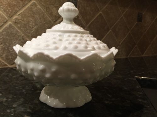 Title (ebay affiliate link): RARE VINTAGE Fenton White Hobnail Milkglass Scallop Pedistal Covered Candy Dish