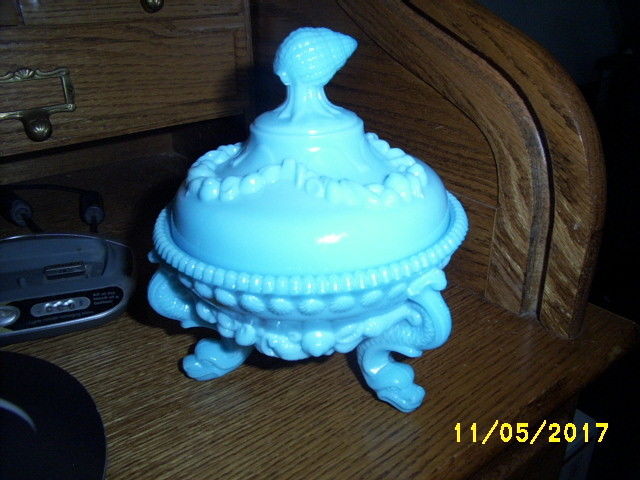 Title (ebay affiliate link): PORTIEUX VALLERYSTHAL BLUE OPALINE MILK GLASS NAUTICAL COVERED DISH WITH STICKER