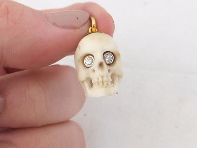 14ct/ 14k gold Diamond eyed antique momento mori carved bone skull pendant, 585