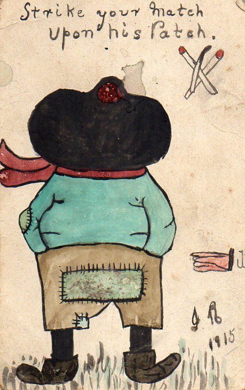 Title (ebay affiliate link): VINTAGE NOVELTY HAND DRAWN/PAINTED postcard STRIKE YOUR MATCH UPON HIS PATCH
