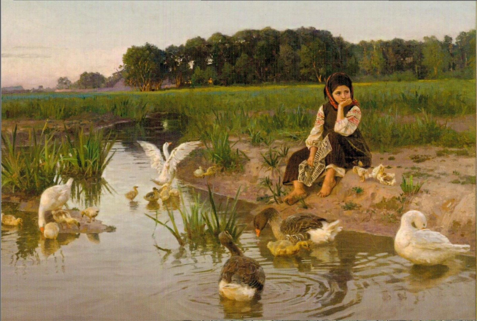 Title (ebay affiliate link): Nikolai Bodarevsky Ukrainian girl tending geese modern Rare new postcard
