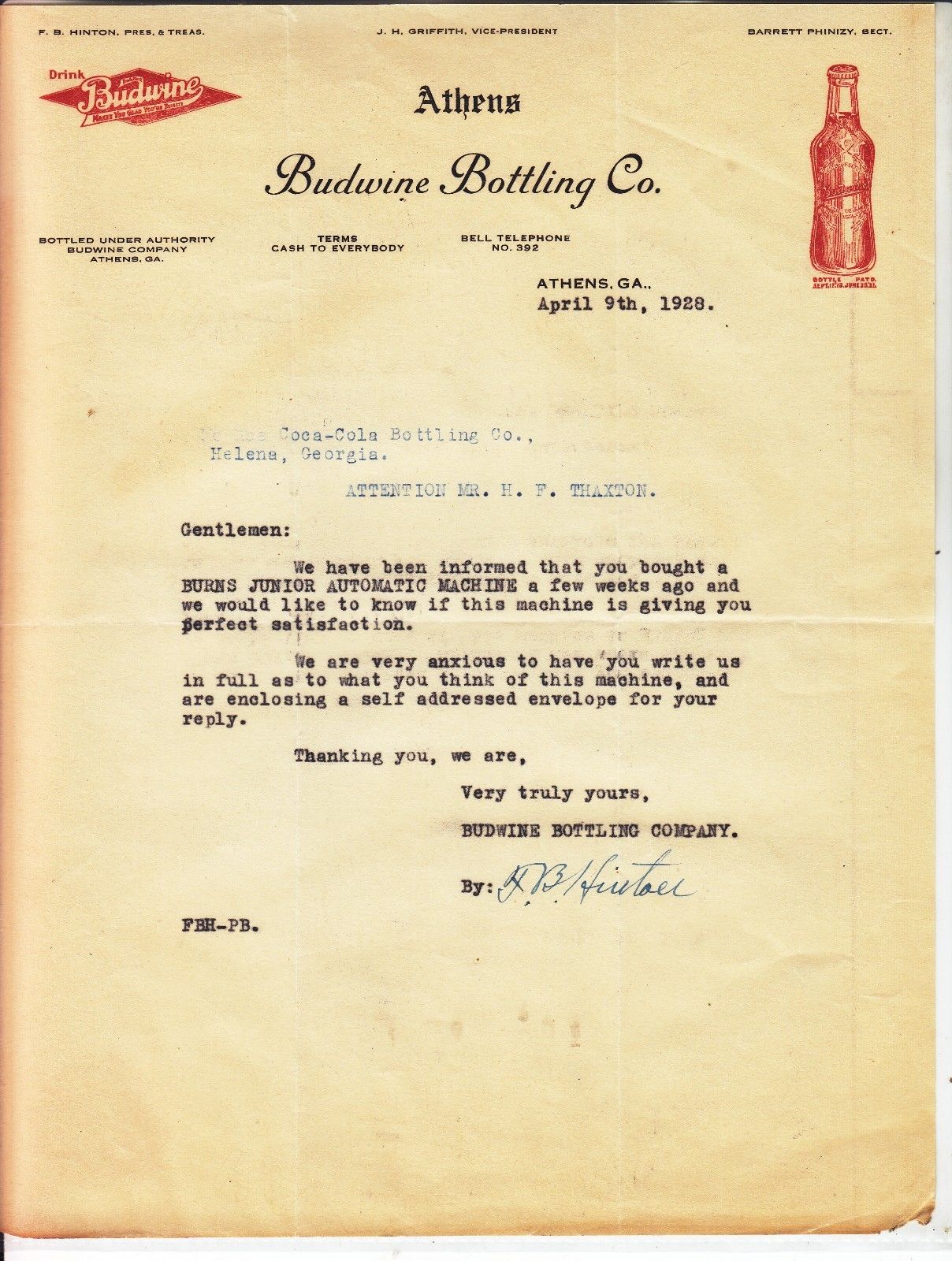 BUDWINE BOTTLING CO. LETTERHEAD ATHENS GA. DATED APRIL 9th, 1928