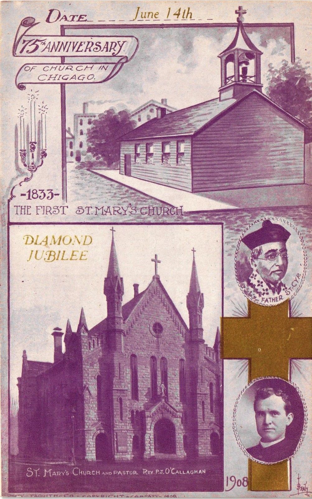 DR JIM STAMPS US POSTCARD FIRST ST MARYS CHURCH DIAMOND JUBILEE CHICAGO 1908