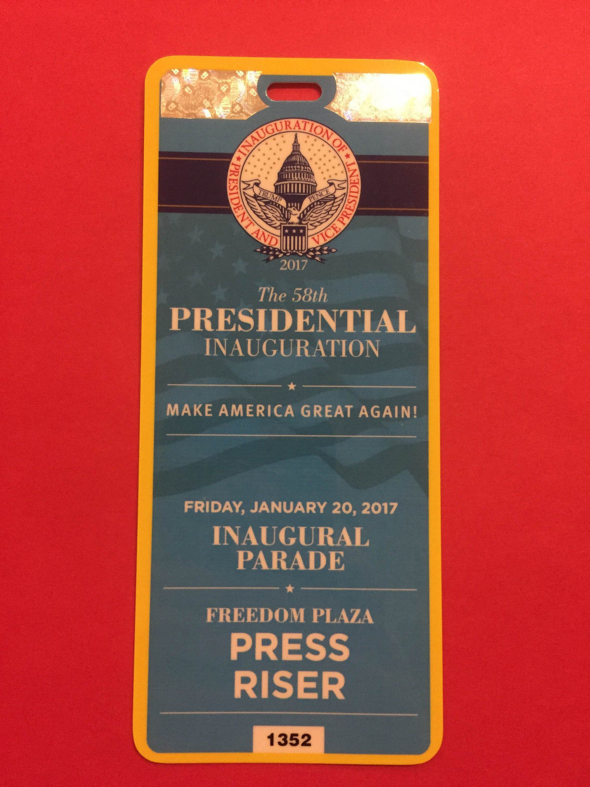 Title (ebay affiliate link): Donald Trump 2017 Inauguration INAUGURAL PARADE MAGA PASS Ticket Credential