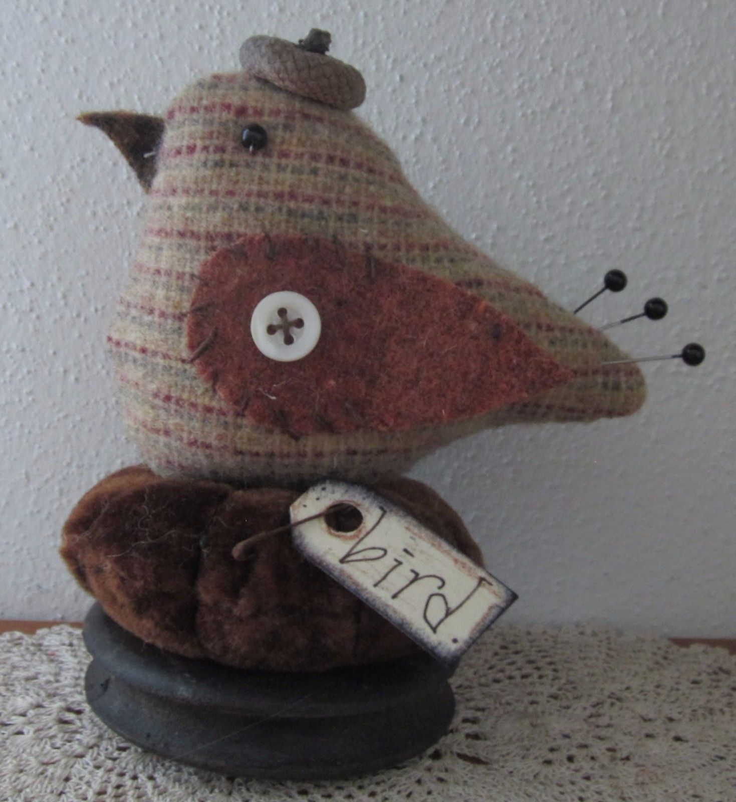 PRIMITIVE WOOL BIRD MAKE DO PIN CUSHION WOODEN PULLEY ACORN CAP PFATT