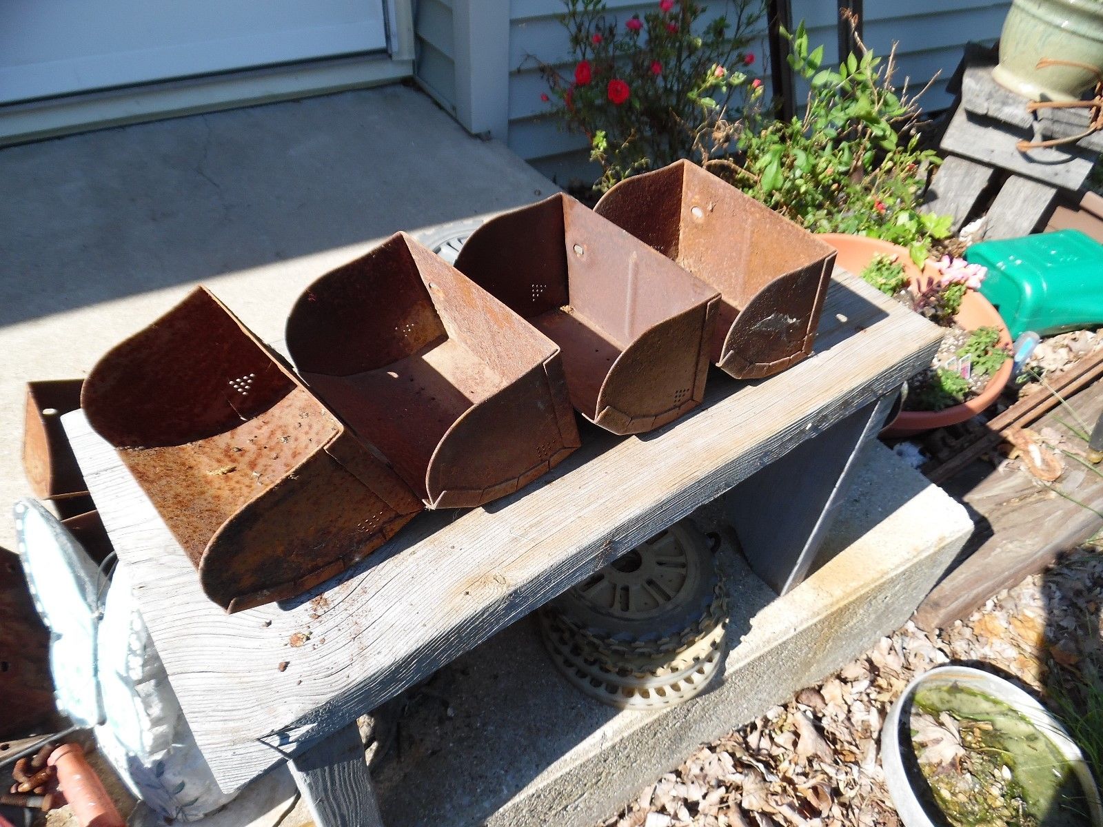 Antique Vintage Metal Farm Grain Elevator Feed Bucket Scoop Primitive! lot of 4