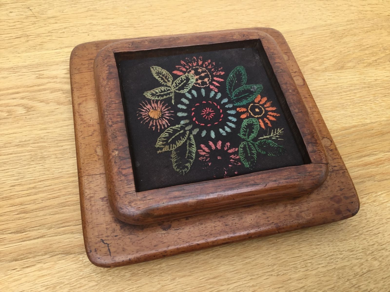 Title (ebay affiliate link): ANTIQUE 19th Century Wooden Mahogany Tea Pot Stand with Original Hand Embroidery