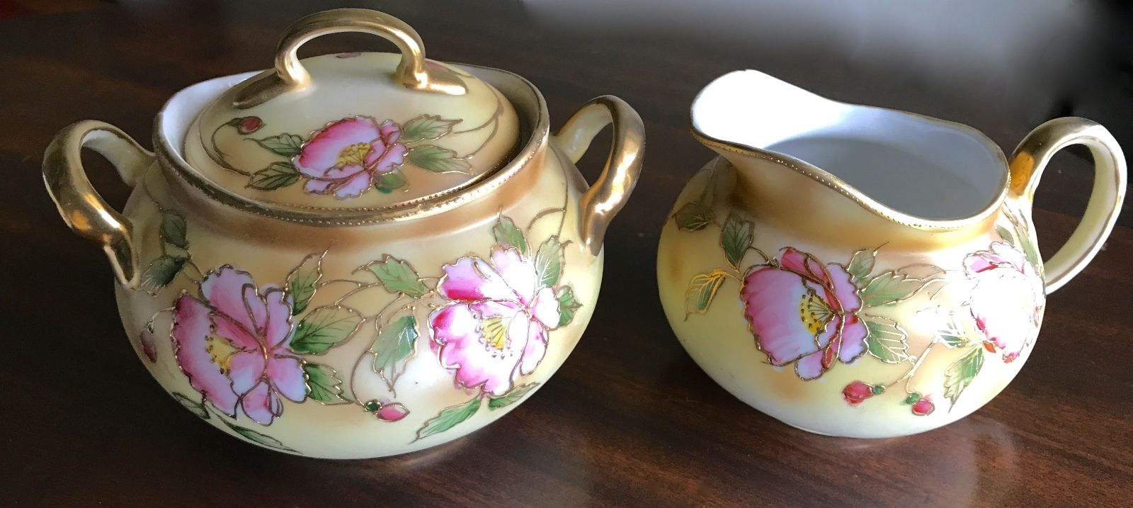 ANTIQUE CREAMER AND COVERED SUGAR BOWL HAND PAINTED BEADING