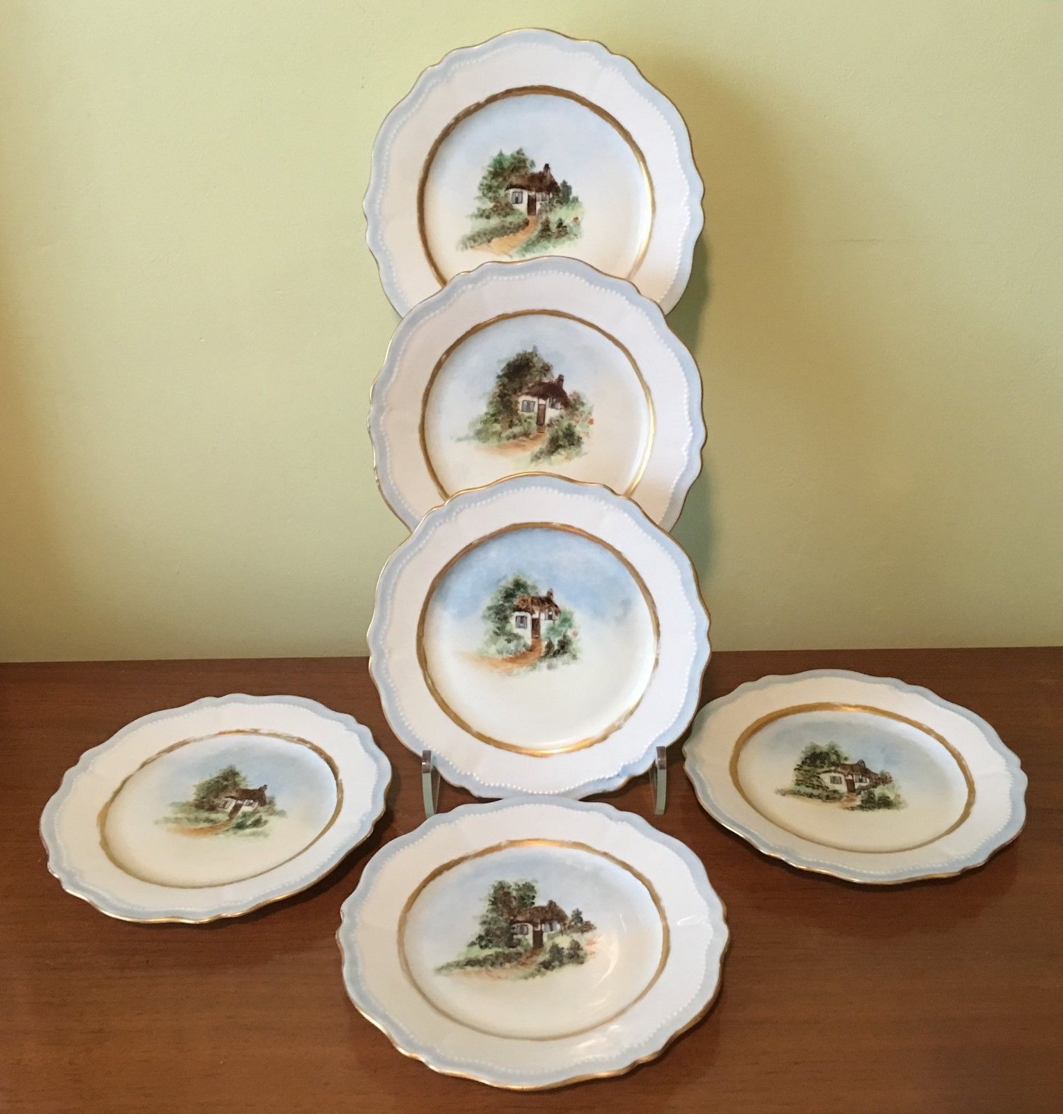 Title (ebay affiliate link): Set of 6 Vintage Hand Painted Cottage Scene Porcelain Plates O&EG Royal Austria