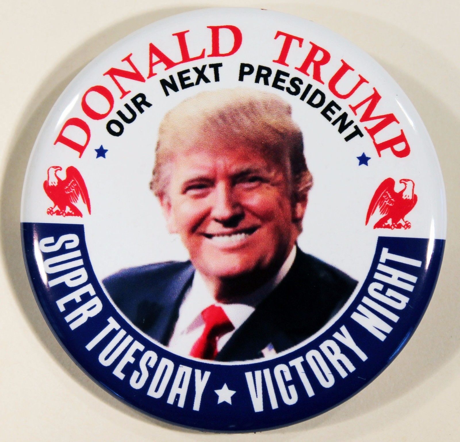 Title (ebay affiliate link): DONALD TRUMP 2016 POLITICAL CAMPAIGN BUTTON -SUPER TUESDAY VICTORY NIGHT
