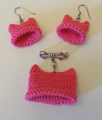 Title (ebay affiliate link): Hot Pink PussyHat Mini Earrings and Brooch Pin Crocheted Pussy Cat Hat Dangles