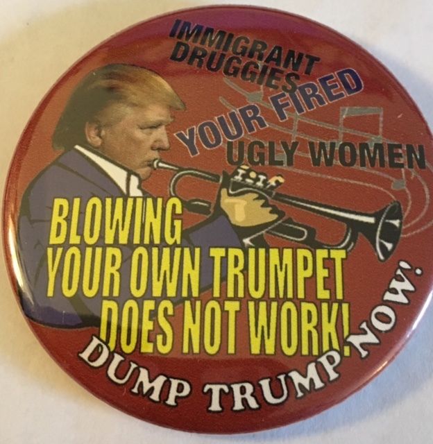 Title (ebay affiliate link): 2 1/2" Dump Trump Now! Blowing Your Own Trumpet Does Not Work" Pinback Button
