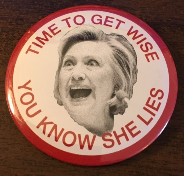 Title (ebay affiliate link): 3" Anti-Hillary "Time To Get Wise - You Know She Lies" Political Pinback Button