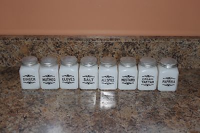 8 Vintage Milk Glass Spice Container with lids Salt Paprika Nutmeg Cloves