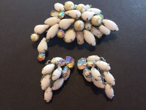 Title (ebay affiliate link): Vintage AB Aurora Borealis Milk Glass Demi Parure Brooch Pin & earrings set!