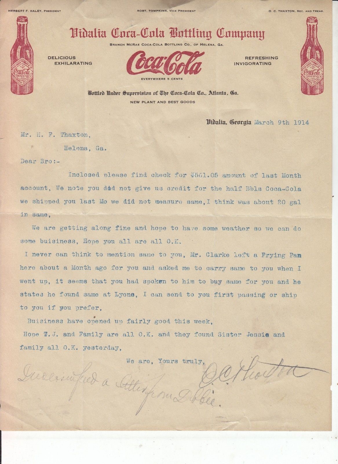 Title (ebay affiliate link): VIDALIA COCA-COLA BOTTLING CO. LETTERHEAD MARCH 9th, 1914 STRAIGHT SIDED BOTTLE