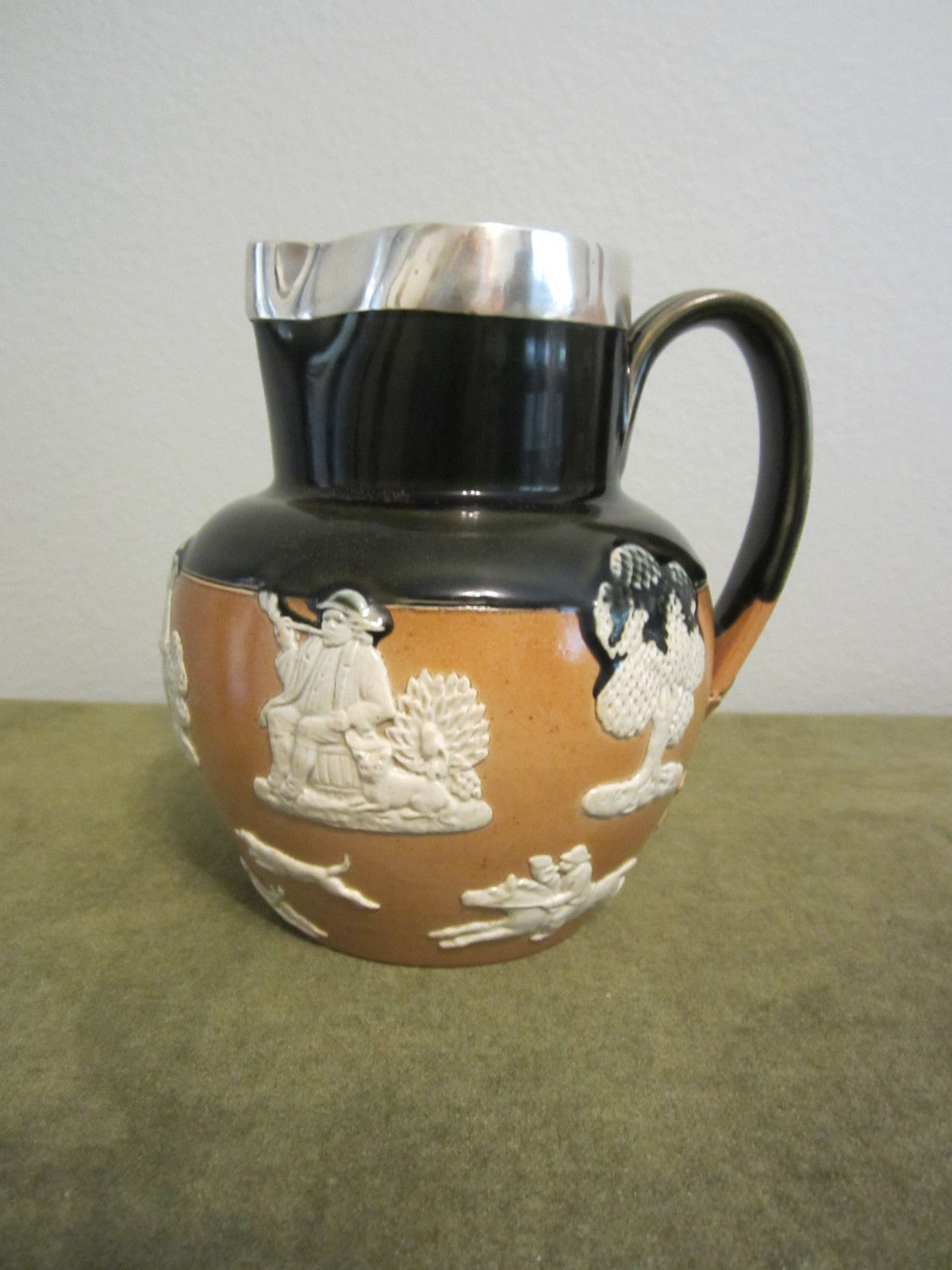 Title (ebay affiliate link): DOULTON LAMBETH MOLDED JUG, GREEN, BLACK & TAN, STERLING RIM, HUNTING SCENE