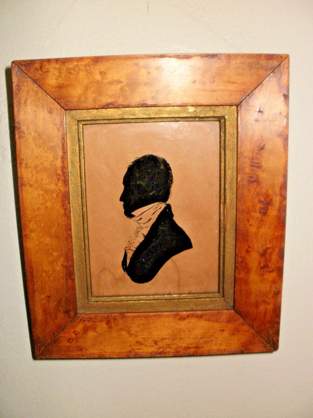 Title (ebay affiliate link): ANTIQUE AMERICAN SILHOUETTE REVERSE PAINTED GLASS BLACK&GOLD, PERIOD BURL FRAME