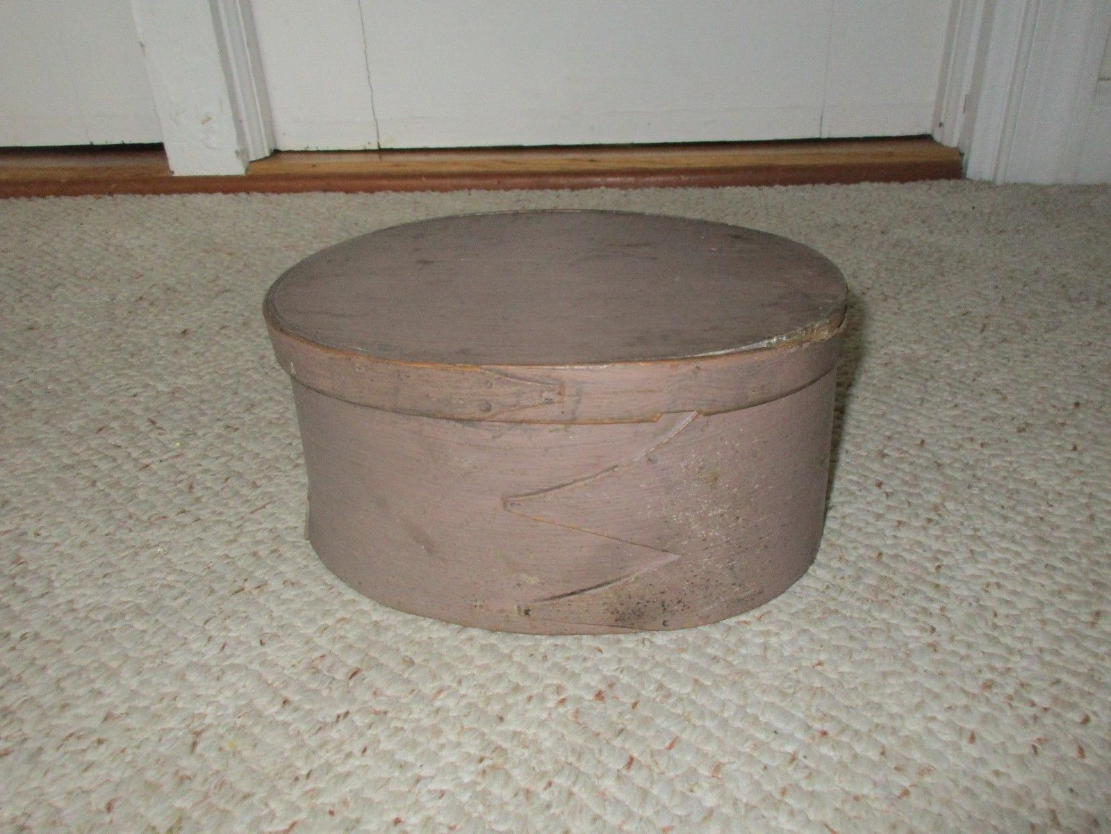 Title (ebay affiliate link): Antique 19thC Primitive Oval Wood 3 Finger Shaker Pantry Box Original Grey Paint