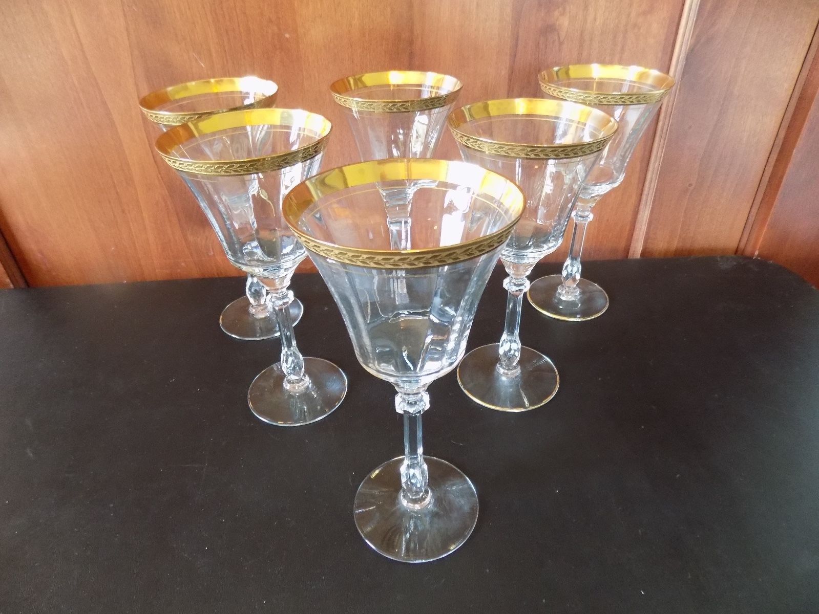 6 Antique Vintage Crystal Wine Water Glasses Gold Gild Leaf Rim