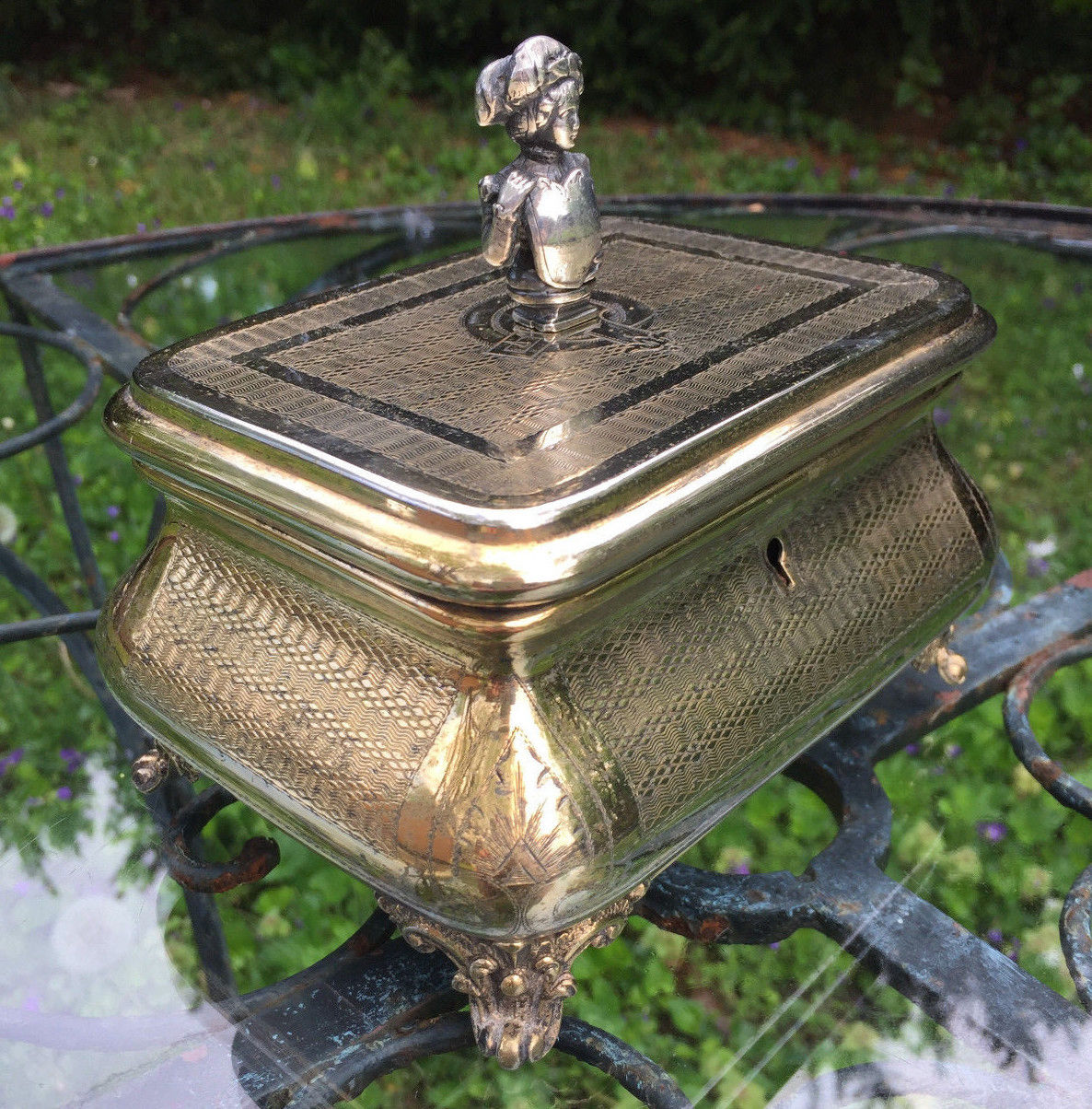 Antique 19th Century Gilt Metal Ethrog Sugar Box by JURST Musketeer Finial