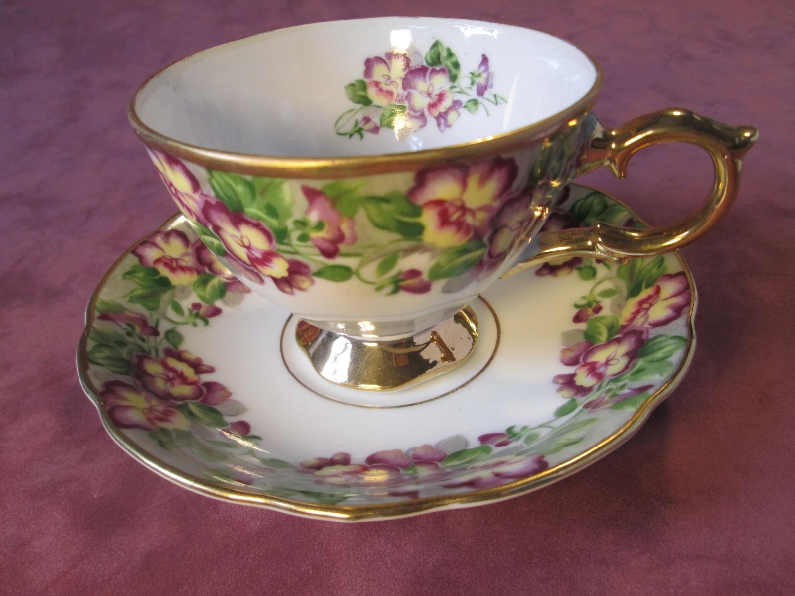 Title (ebay affiliate link): VINTAGE ROYAL SEELEY TEACUP AND SAUCER PURPLE FLOWERS WHITE AND GOLD