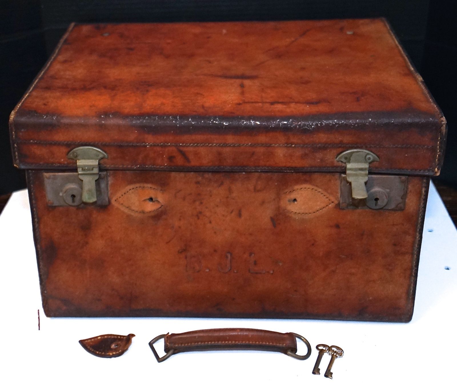 Title (ebay affiliate link): Antique Leather or Vellum suitcase / trunk. 1860s. With Keys. N. Benjamin London