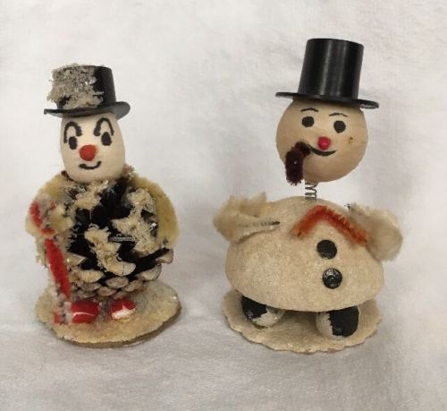 Title (ebay affiliate link): 2 Antique Vintage CHRISTMAS ORNAMENT SPUN COTTON SNOWMAN Nodder Pinecone