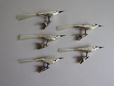 5 VINTAGE 4" tall CLIP ON BLOWN GLASS Silver SONG BIRDS CHRISTMAS ORNAMENTS