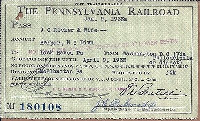 Title (ebay affiliate link): 1933 The Pennsylvania Railroad Pass to Lock Haven, Pa.
