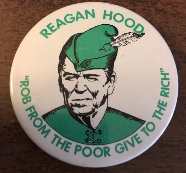 Title (ebay affiliate link): Uncommon Sized 2 1/4" Reagan Hood "Rob From the Poor Give to the Rich" Button