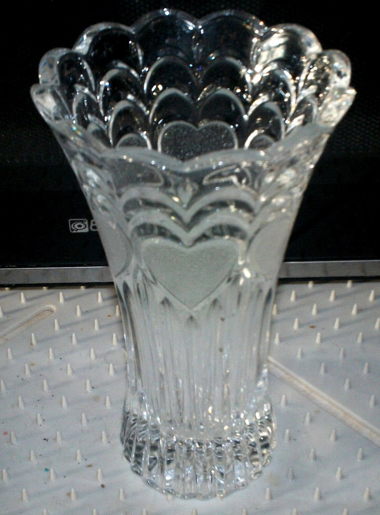 Title (ebay affiliate link): CLEAR LEAD CRYSTAL GLASS VASE SCALLOP TOP EDGE FROSTED HEARTS 7" TALL