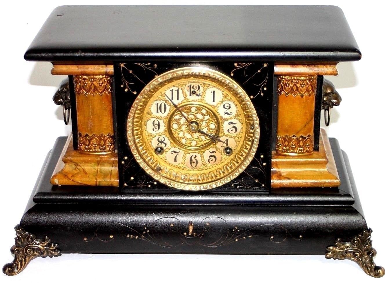 Title (ebay affiliate link): ANTIQUE VICTORIAN GILBERT 1905 "ROYAL" EBONIZED BLACK MANTEL CLOCK W/ LION HEADS